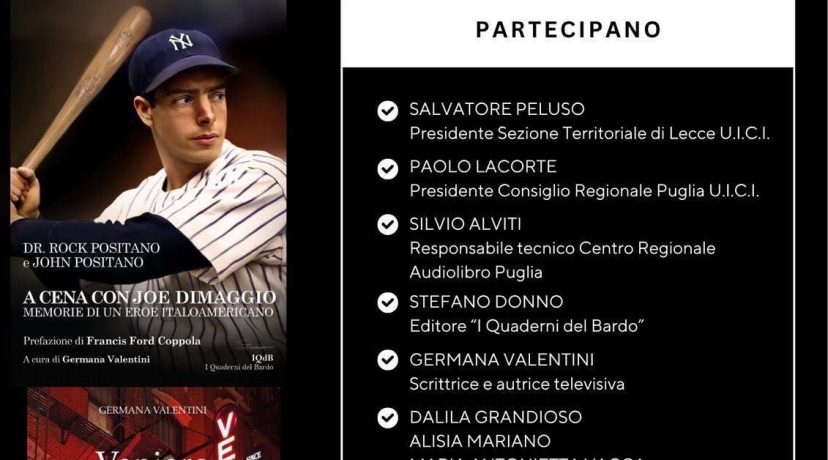 La serata sarà l’occasione per presentare due opere di grande interesse: “A cena con Joe DiMaggio” di Dr. Rock Positano e John Positano, e “Veniero” di Germana Valentini, scrittrice e autrice televisiva. Ad arricchire l’incontro interverranno Stefano Donno, editore de “I Quaderni del Bardo”, e la stessa Germana Valentini, che dialogherà con il pubblico sulle tematiche dei libri.